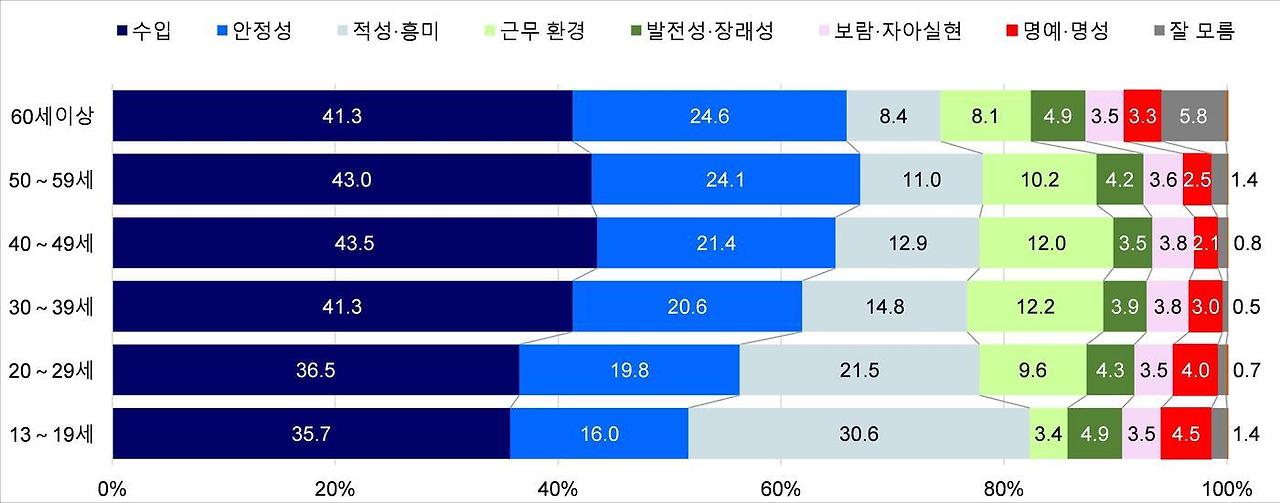 이 그래프는 한국 내 다양한 연령대의 직업 속성 선호도를 보여주고 있어요. 연령대가 높아질수록 안정성과 수입을 더 중요시하는 경향이 있죠.