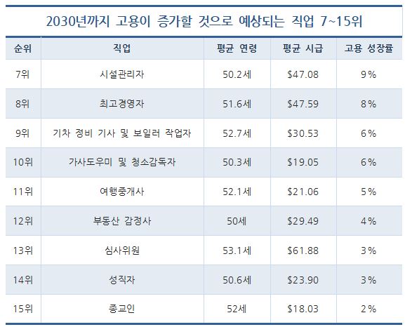 이 표는 2030년까지 고용이 증가할 것으로 예상되는 직업들을 보여주고 있어요. 이러한 변화는 앞으로의 직업 시장에도 큰 영향을 미칠 것으로 보입니다.