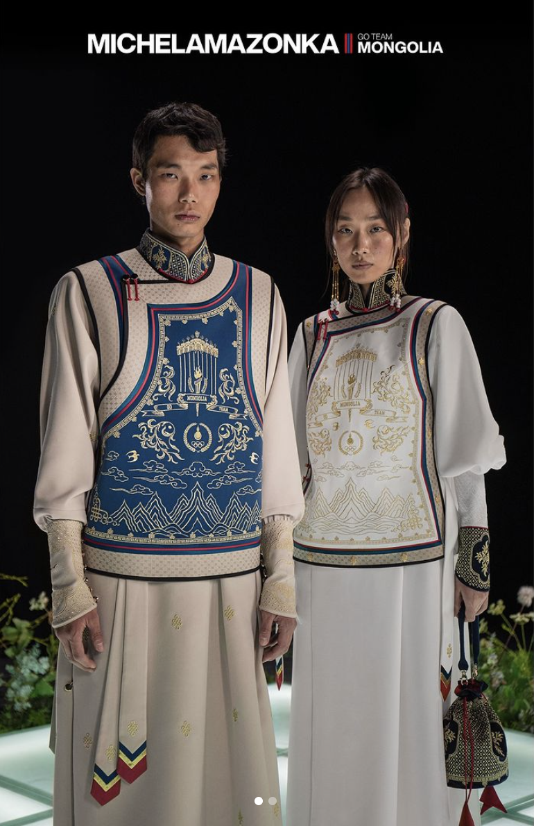 이번 해 선수단복의 best 승자는 단연 미셸앤드아마존카가 만든 몽골의 단복이 될 듯합니다. 한 벌을 만드는데 20시간이 걸릴 정도의 수작업으로 몽골 전통 문양을 바탕으로 파리를 상징하는 에펠탑과 성화까지 담아냈는데요. 아름다운 드레이프와 주름, 정교한 자수까지 패션위크에 등장해도 될 것 같은 우아함으로 전 세계 올림픽 팬들의 주목을 받았습니다.