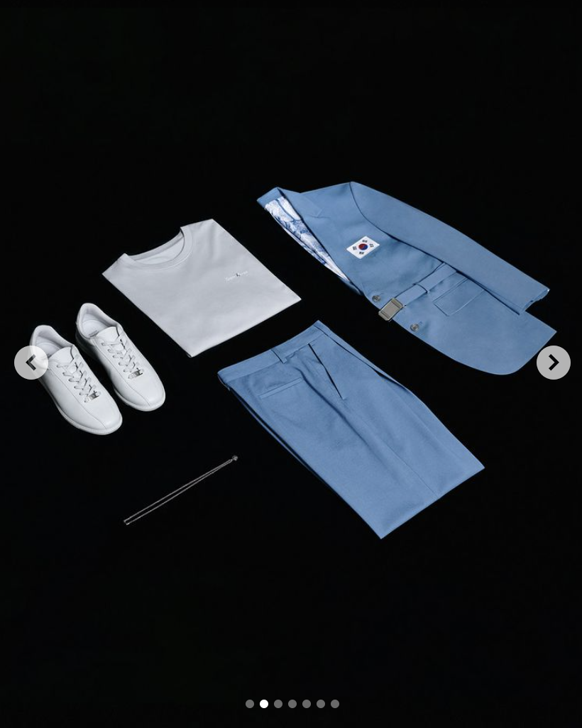 대한민국 국가대표 선수단복은 벨티드 셋업 형태로 디자인되었습니다. 이는 전통 관복에서 착안하여 현대적인 감각으로 재해석한 것입니다. 벨트는 전통 관복의 '대'를 모티브로 만들어졌는데, 이는 조선시대 계급을 나타내는 장식이기도 했습니다. 벽청색을 메인 색상으로 사용한 것도 동쪽을 상징하며, 젊음과 진취적 정신을 담고자 하는 의미입니다.